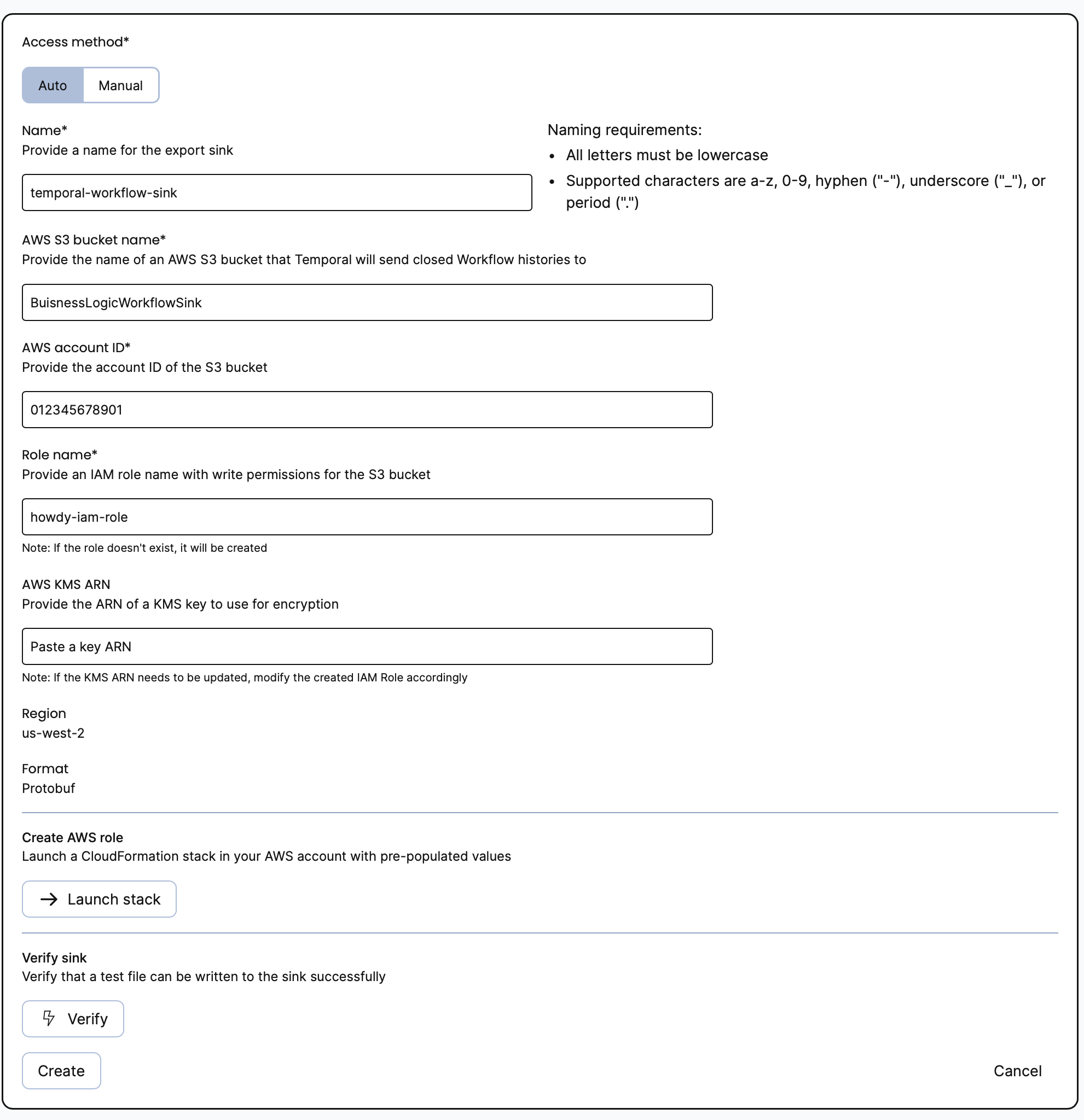 The Temporal Cloud UI provides two ways for configuring Workflow History Export: